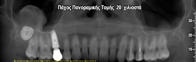 Περίπτωση εκτεταμένης οδοντοφόρου κύστης σχετιζόμενης με τον έγκλειστο 3ο γομφίο 18 όπου παρατηρείται εμπλοκή του δεξιού ιγμορείου άντρου σε γυναίκα ασθενή ηλικίας 45 ετών.