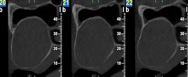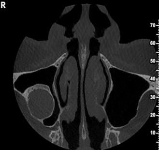 Η κύστη έχει προκαλέσει ιδιαίτερα εκτεταμένη υπέγερση του εδάφους του ιγμορείου άντρου προβάλλοντας εντός αυτού και καταλαμβάνοντας μεγάλο τμήμα της αεροφόρου του κοιλότητας.