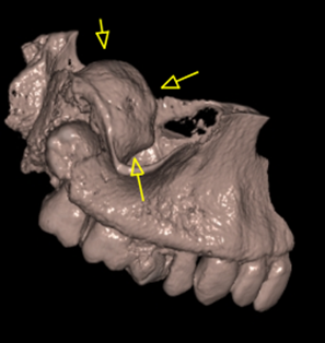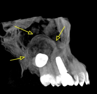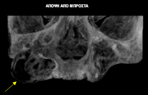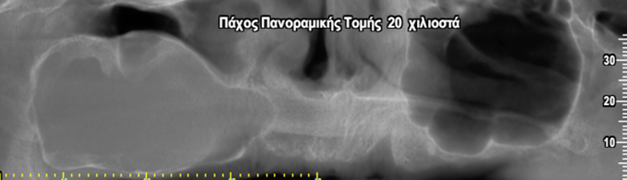 Η κύστη καταλαμβάνει πλήρως τη φατνιακή ακρολοφία στην οπίσθια δεξιά περιοχή της γνάθου και έχει προκαλέσει ιδιαίτερα εκτεταμένη υπέγερση του εδάφους του ιγμορείου άντρου προβάλλοντας εντός αυτού και καταλαμβάνοντας μεγάλο τμήμα της αεροφόρου του κοιλότητας.