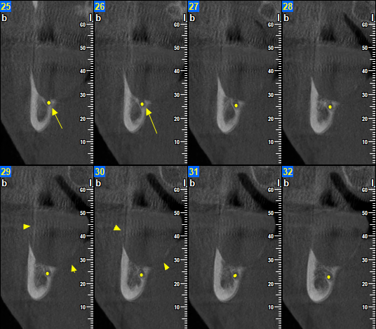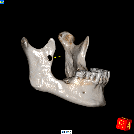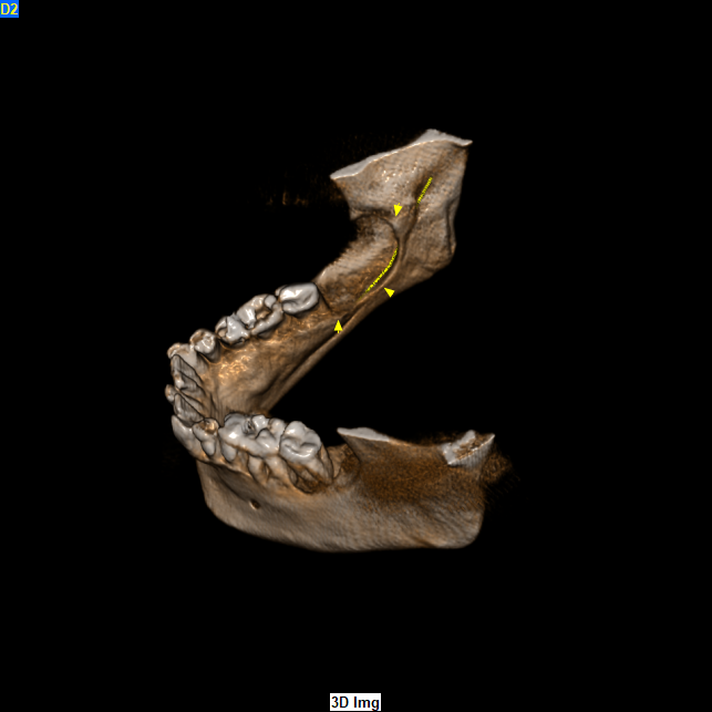 Το CBCT αποκάλυψε την παρουσία εκτεταμένης υπόπυκνης αλλοίωσης στην οπίσθια δεξιά περιοχή της κάτω γνάθου οπισθίως των υπαρχόντων δοντιών η οποία είχε προκαλέσει εκτεταμένη έκπτυξη, λέπτυνση και λύση των συμπαγών πετάλων, ενώ είχε απωθήσει και τον πόρο του κάτω φατνιακού νεύρου προς τα κάτω.