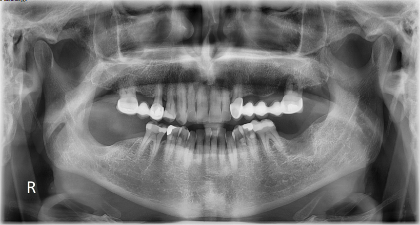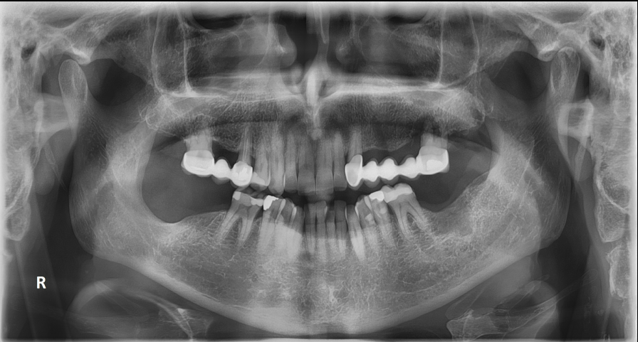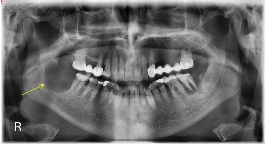 Άνδρας ασθενής 77 ετών εμφάνισε προ 4 ετών ενδοστοματικό ογκίδιο για την ακτινολογική διερεύνηση του οποίου συστήθηκε η πραγματοποίηση πανοραμικής ακτινογραφίας. Στην πανοραμική ακτινογραφία παρατηρήθηκε η παρουσία ευμεγέθους ακτινοδιαυγαστικής αλλοίωσης η οποία απεικονίζεται στην περιοχή της αναφερόμενης ενδοστοματικής βλάβης.